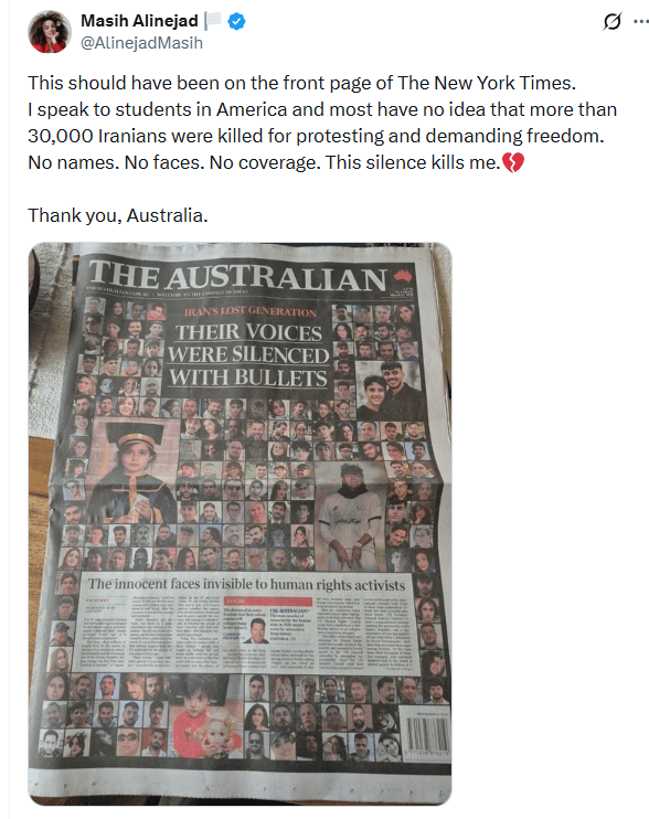 There’s many Iranians such as Nazanin Nour and Masih Alinejad who are publicly advocating for their people and countering false media reports by Western reporters who are not Iranian and either don’t know what’s happening or they are just lying. CNN was given access inside Iran by the government because the government themselves knew they would tell their side of the story. I listened to a BBC report by a British man last night who asserted that America is considered an enemy by the “Iranian people.” This contradicts the large majority of Iranian voices I know and my personal experience of Iranians seeking me out for friendship while in SE Asia precisely because I’m American. These are some of the most kind, thoughtful, intelligent, and freedom-loving people I know.